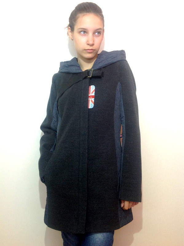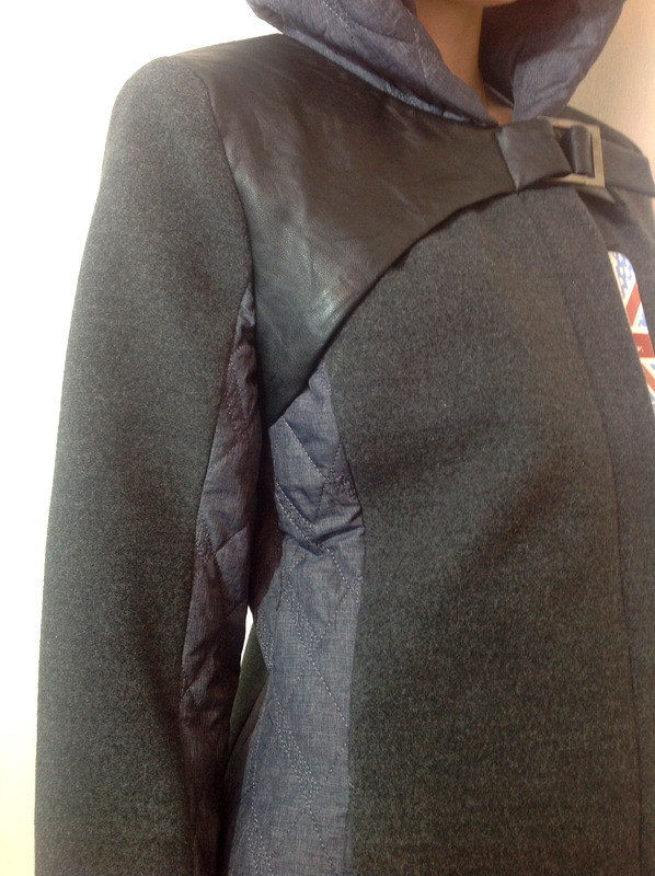 Демісезонне пальто виготовлене з кашеміру без утеплювача, вставки стьобана плащівка. Оздоблення скринь. шкіра. Модель має каптур. Підкладка нейлон, фурнітура метал нікель. В наявності розміри з 38 по 44. На фото модель зріст 160 см. одягнений р 44.